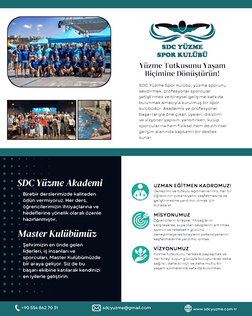25 Yaş üstü master yüzme spor kulübümüz haftaiçi 2 gün havuz ve 1 gün kara antrenmanı yapmaktadır. Kısa kulvar ve uzun kulvar havuz yarışlarının yanısıra İstanbul ve Çanakkale Boğazı dahil tüm açıksu yarışlarına katılmaktadır. Bu benzersiz deneyimlere ulaşmak için bize ulaşabilirsiniz.